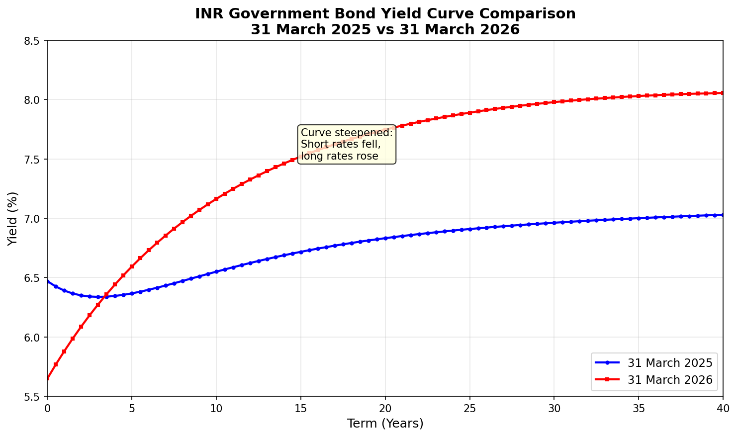 The visual tells the story: the curve has steepened dramatically. Short-term rates dropped as the RBI cut the repo rate, but long-term rates moved in the opposite direction.